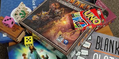 Join us for some fun games and a cheerful evening! We'll bring lots of games and pizza. We have over 100 games and love teaching people how to play. Come for 30 minutes or the whole night!
